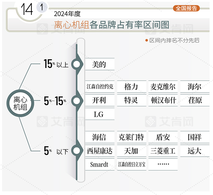 分品牌表現(xiàn)方面,美的以超15%的市場(chǎng)占有率獨(dú)占鰲頭,成為離心機(jī)銷(xiāo)售規(guī)模最大的企業(yè)。2024年,美的推出新一代磁懸浮離心機(jī)組,豐富產(chǎn)品線,并率先提出10+5質(zhì)保政策,在高效機(jī)房、節(jié)能改造等業(yè)務(wù)領(lǐng)域多點(diǎn)開(kāi)花,建立諸多樣板工程。
