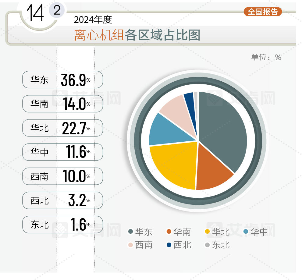 從區(qū)域市場(chǎng)來(lái)看,華東地區(qū)以36.9%的占有率位居首位,強(qiáng)大的經(jīng)濟(jì)實(shí)力和活躍的民營(yíng)經(jīng)濟(jì)為離心機(jī)市場(chǎng)提供廣闊空間;華北地區(qū)以22.7%位列第二,工業(yè)項(xiàng)目是其市場(chǎng)發(fā)展的重要支撐;華南地區(qū)占有率為14.0%,新能源、醫(yī)療等領(lǐng)域成為離心機(jī)主要應(yīng)用場(chǎng)景;華中、西南地區(qū)分別以11.6%、10.0% 的占有率,依托數(shù)據(jù)中心和院校等民用項(xiàng)目推動(dòng)市場(chǎng)發(fā)展;西北地區(qū)占有率3.2%,東北地區(qū)占有率1.6%,市場(chǎng)規(guī)模相對(duì)較小。
