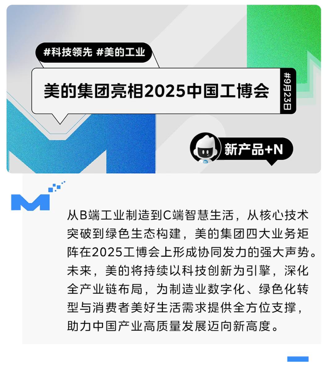 2025年9月23日,第25屆中國國際工業(yè)博覽會(huì)在上海開幕,作為全球科技巨頭,美的集團(tuán)攜工業(yè)技術(shù)事業(yè)群、庫卡(KUKA)、樓宇科技事業(yè)群、智能家居事業(yè)群四大核心業(yè)務(wù)單位集體亮相,以“全場(chǎng)景創(chuàng)新、全鏈路賦能”為核心,從工業(yè)制造核心部件到智能工廠解決方案,從綠色樓宇技術(shù)到全屋智慧生活體驗(yàn),全方位展現(xiàn)其在智能制造與綠色低碳領(lǐng)域的全產(chǎn)業(yè)鏈實(shí)力,為中國制造業(yè)數(shù)字化轉(zhuǎn)型與可持續(xù)發(fā)展注入強(qiáng)勁動(dòng)力。