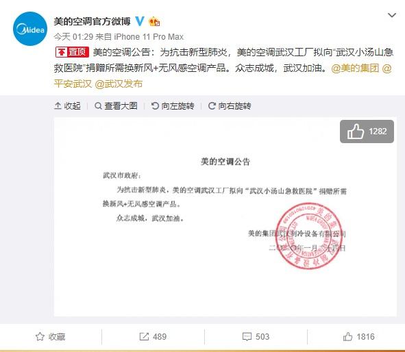 IT之家1月24日消息 今天凌晨,美的官方宣布,為抗擊新型肺炎,美的空調(diào)武漢工廠擬向“武漢小湯山急救醫(yī)院”捐贈所需換新風+無風感空調(diào)產(chǎn)品。眾志成城,武漢加油。