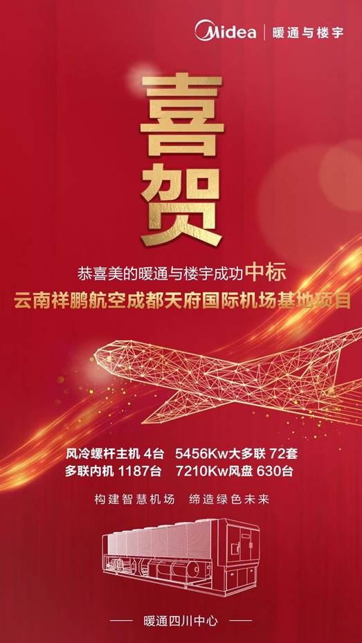 從美的暖通與樓宇四川中心獲悉,該中心成功中標云南祥鵬航空成都天府國際機場基地項目,該項目使用的是美的風冷螺桿主機4臺,大多聯(lián)機72套,總制冷量5456KW,多聯(lián)機內(nèi)機1187臺,風盤 630臺,總制冷量7210Kw。該項目的工程中標,也為美的暖通在四川市場樹立了標桿。構(gòu)建智慧機場,締造綠色未來。