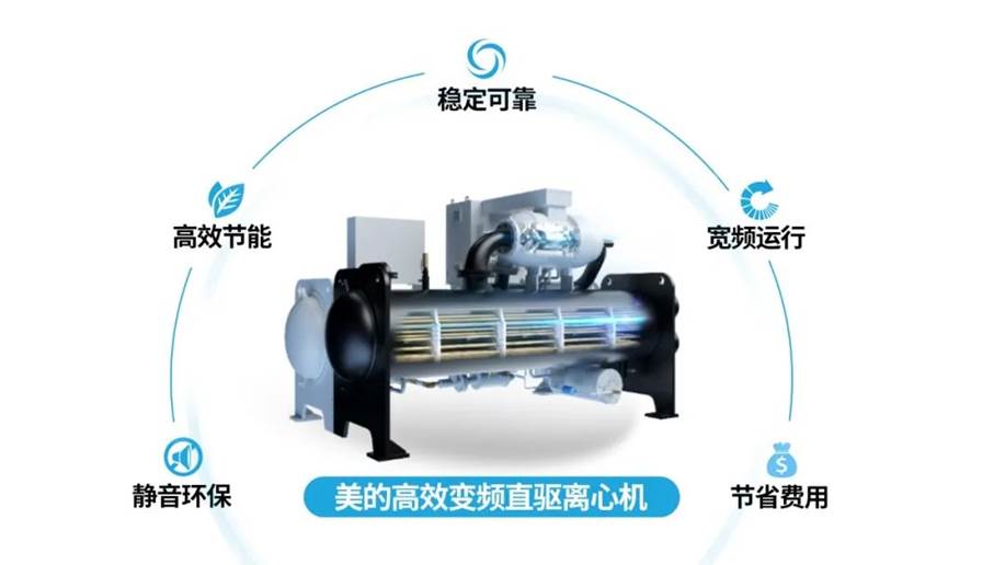 經(jīng)過對機(jī)房航站樓全年負(fù)荷模擬分析,考慮極端氣候情況、負(fù)荷波動大、備用性等需求,項目采用兩臺550冷噸美的高效變頻直驅(qū)離心機(jī)組,在國標(biāo)工況下COP達(dá)到6.37,IPLV達(dá)到9.08,屬于雙一級能效。同時機(jī)組搭配美的端蓋式在線清洗裝置,保證機(jī)組全年運(yùn)行高效性。