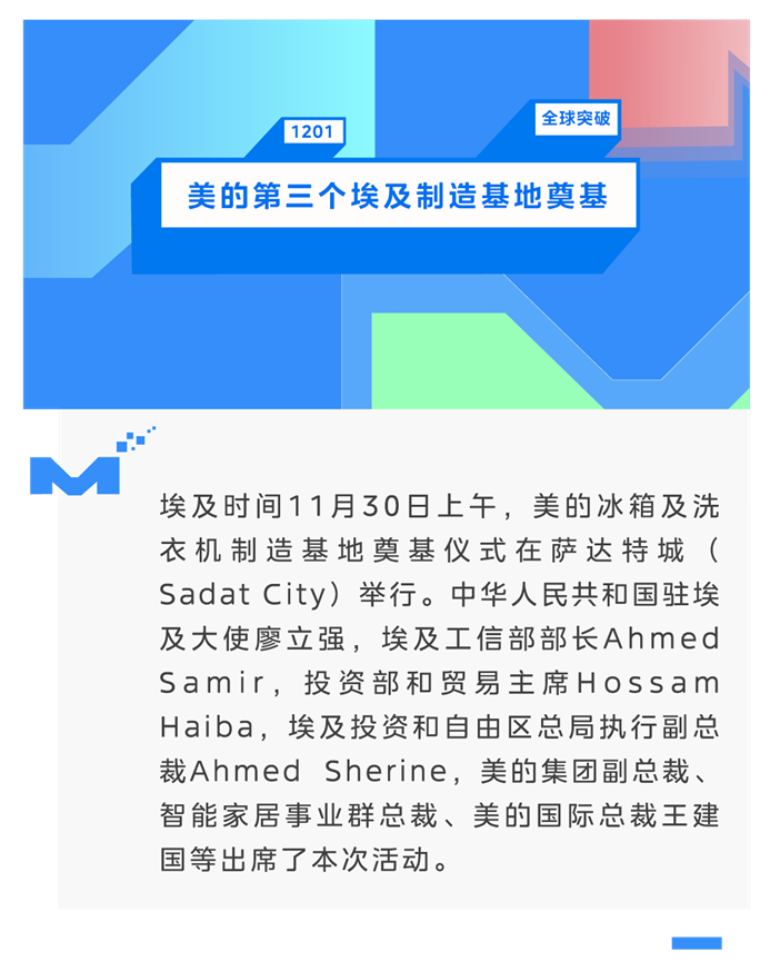 據(jù)悉,美的埃及冰箱及洗衣機(jī)新基地占地面積22.2 萬(wàn)平方米,總投資額8.3億人民幣,預(yù)計(jì)將于2025年下半年正式投產(chǎn)運(yùn)營(yíng),這也是美的在埃及布局的第三個(gè)制造基地。