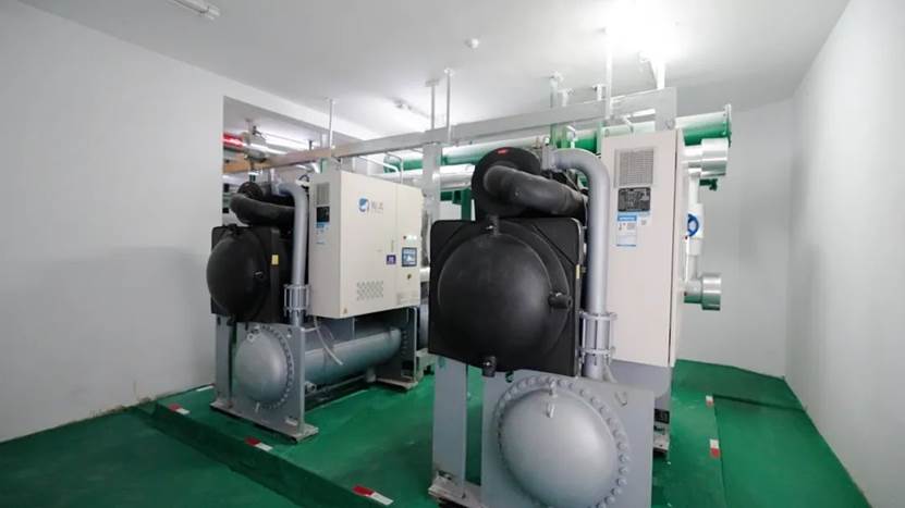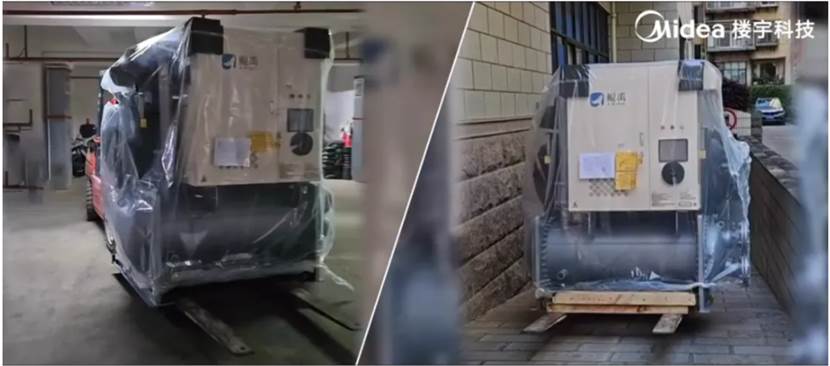 威龍飯店的制冷機(jī)房位于大樓的負(fù)二層,無(wú)設(shè)備運(yùn)輸通道,對(duì)設(shè)備能效及尺寸要求極高??紤]到機(jī)房位置的特殊性,美的鯤禹模塊化磁懸浮離心機(jī),創(chuàng)新模塊化設(shè)計(jì),結(jié)構(gòu)緊湊,體積小巧,占地面積小,完美匹配場(chǎng)地大?。涣硗?,左右管板設(shè)計(jì)有叉車孔,不需要專門的起重機(jī)和其他設(shè)備,現(xiàn)場(chǎng)可用叉車運(yùn)輸及吊桿從樓梯間調(diào)運(yùn),突破原本的空間限制,輕松完成設(shè)備的運(yùn)輸和安裝。此外,工廠快速生產(chǎn)到貨與安裝運(yùn)行,大大縮短了施工周期,得到了安裝單位及酒店一致好評(píng)。