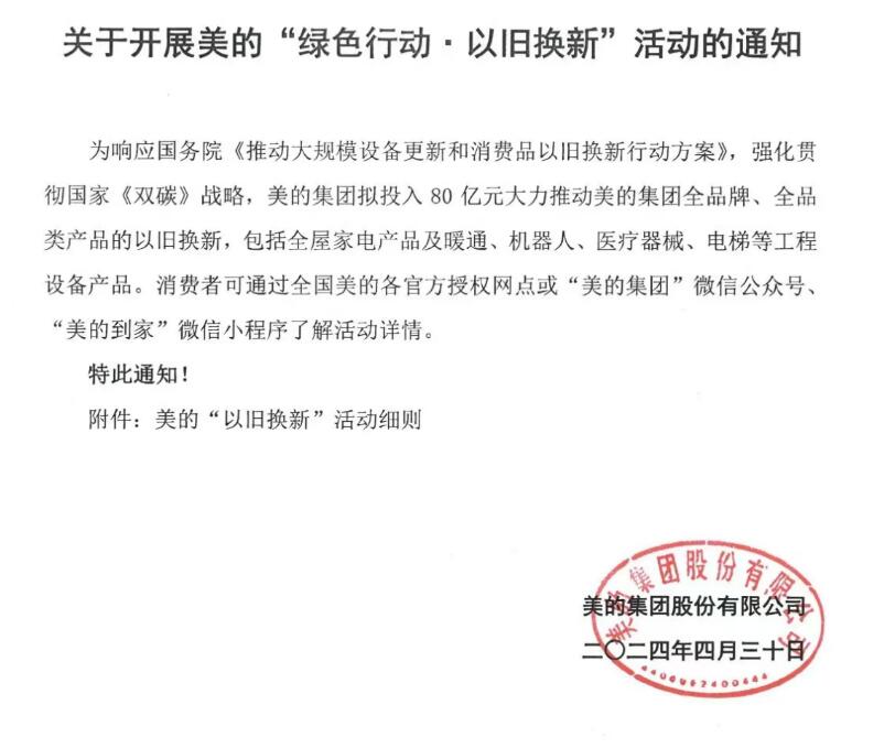 在持續(xù)開拓發(fā)掘新技術、新場景、新應用之外,美的也積極響應國家“以舊換新”號召。4月23日,美的集團宣布將投入80億元人民幣,大規(guī)模推動旗下全品牌和全產(chǎn)品類別的以舊換新及設備更新行動,其中,美的樓宇科技啟動“綠色行動·以舊換新”計劃,為新簽約的改造項目提供新機補貼優(yōu)惠和舊改專項服務支持,幫助老舊建筑煥發(fā)新生,賦能城市低碳發(fā)展新未來。